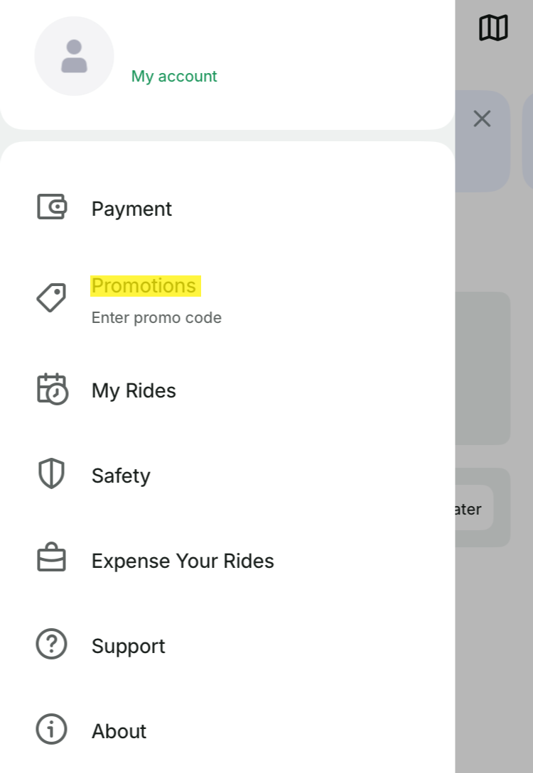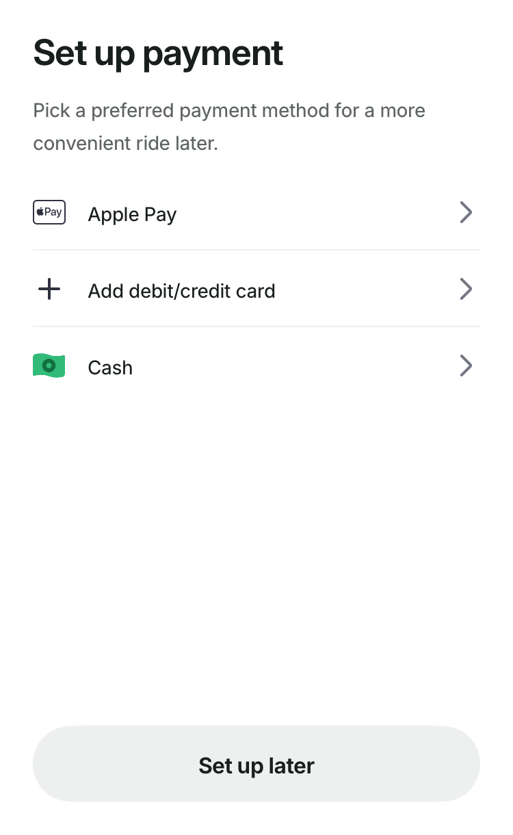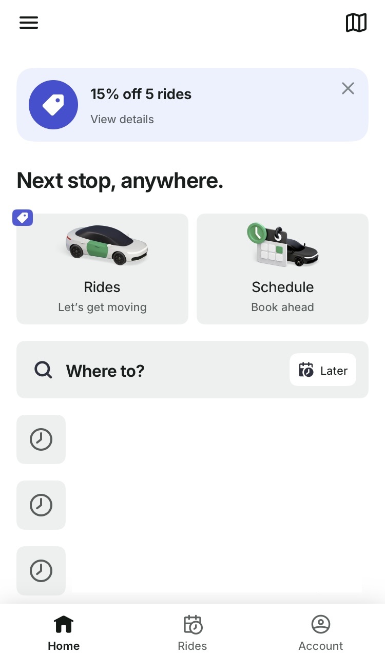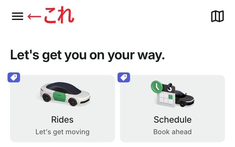 ★アプリのトップ画面で「Rides」もしくは「Where to?」を選択