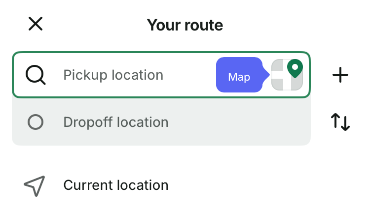 それ以外の場所へ配車する場合は「Pickup location」へ文字入力する、もしくはMapから場所を選択しましょう。