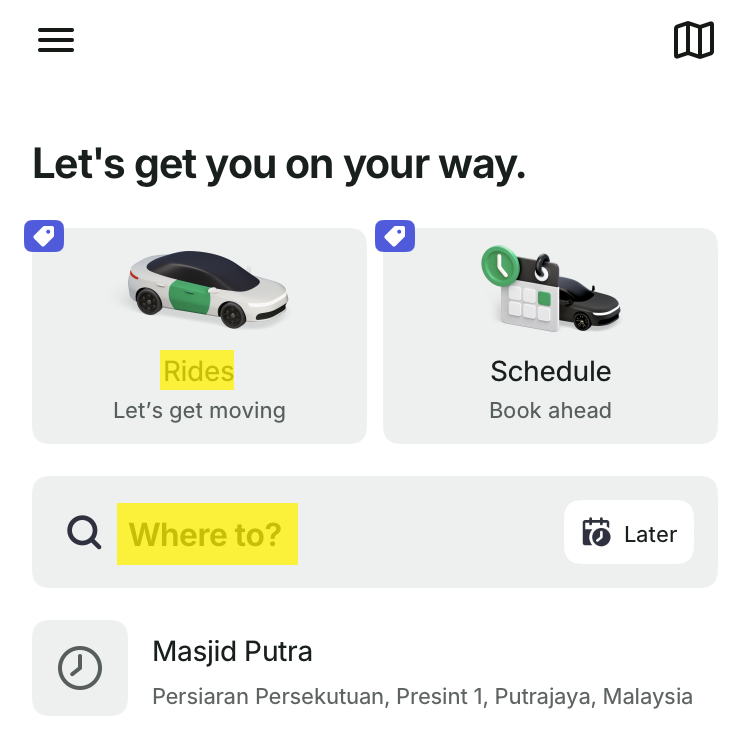 Grabと同じ感覚で使え、現在地と目的地を入力するだけで車を配車可能です。