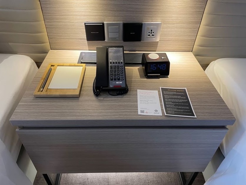 2台のベッド間にあるサイドテーブルには、電話・目覚まし時計・メモ帳&鉛筆等がありました。