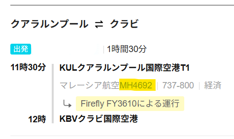 コードシェア便名でマレーシア航空便(MH4692)の航空券を予約