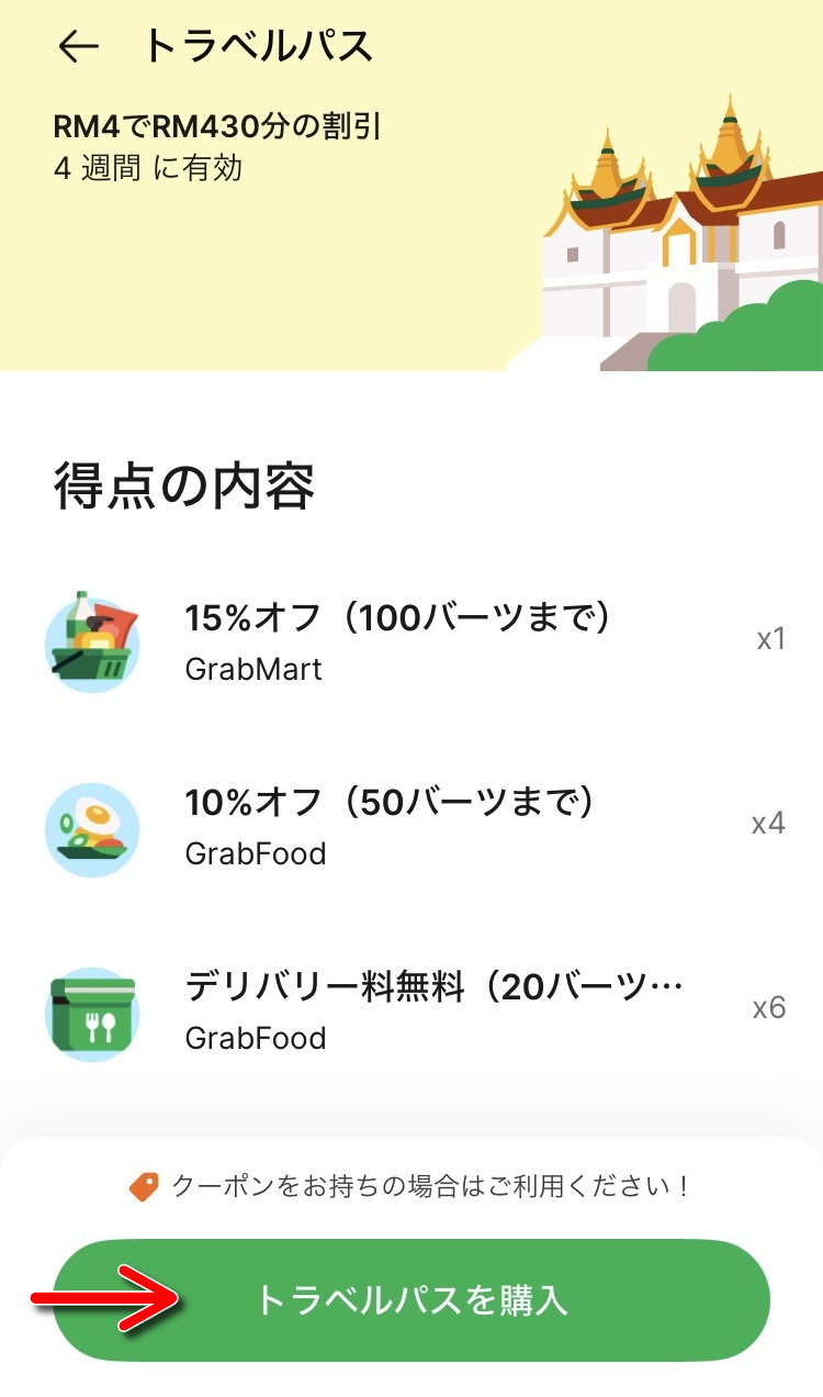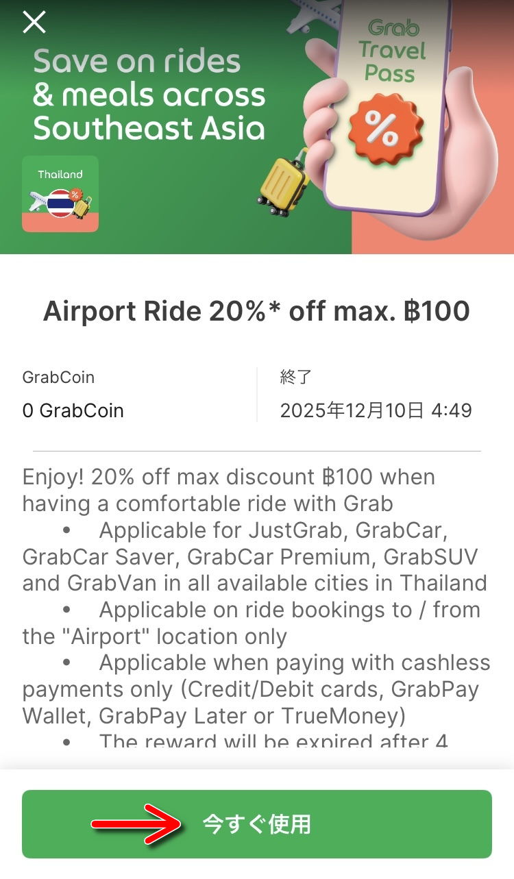 Grab Travel Passの購入方法を以下で実際の購入画面を提示しながらご説明します。