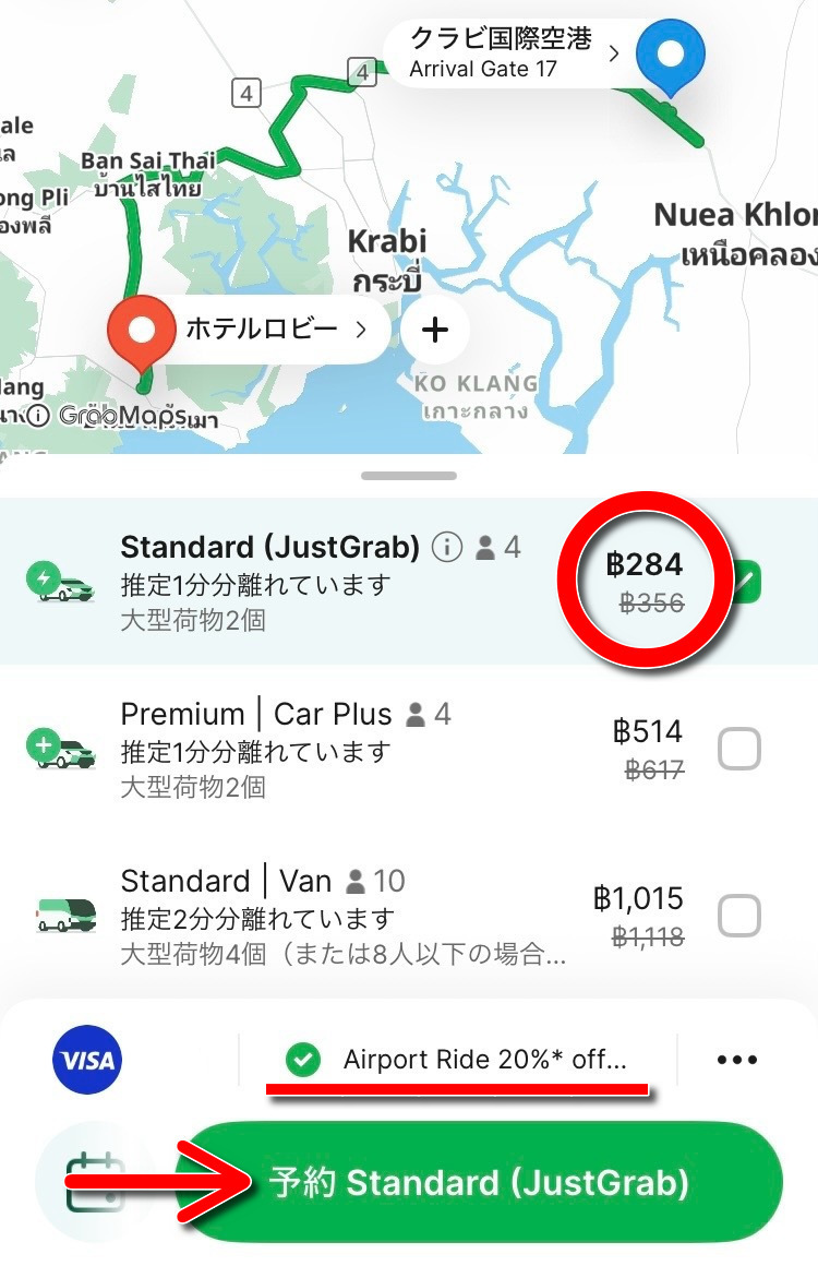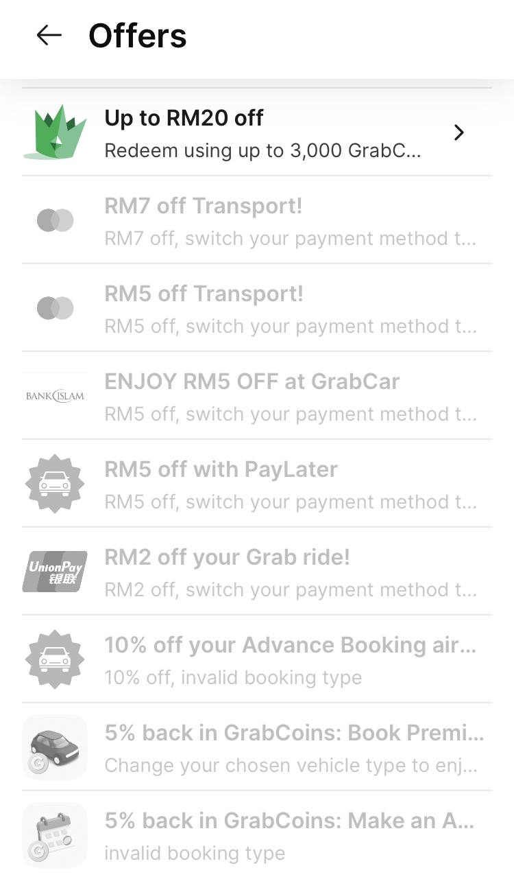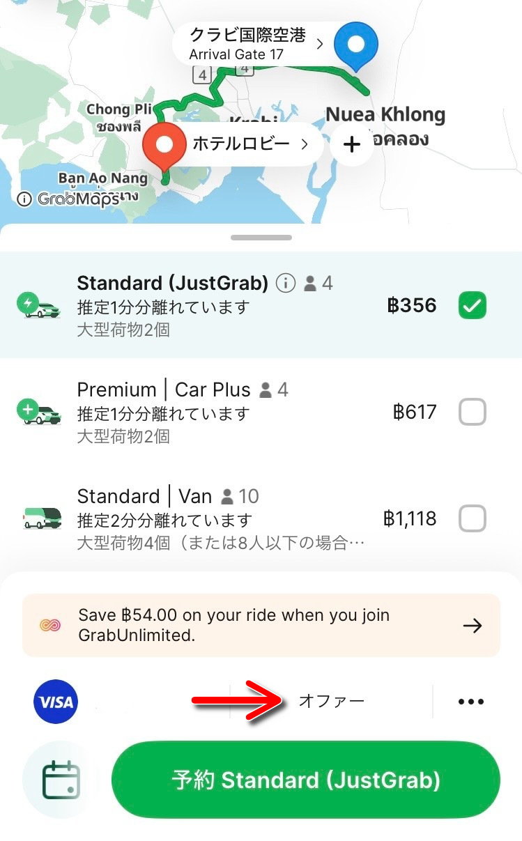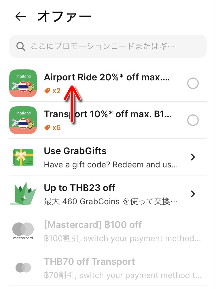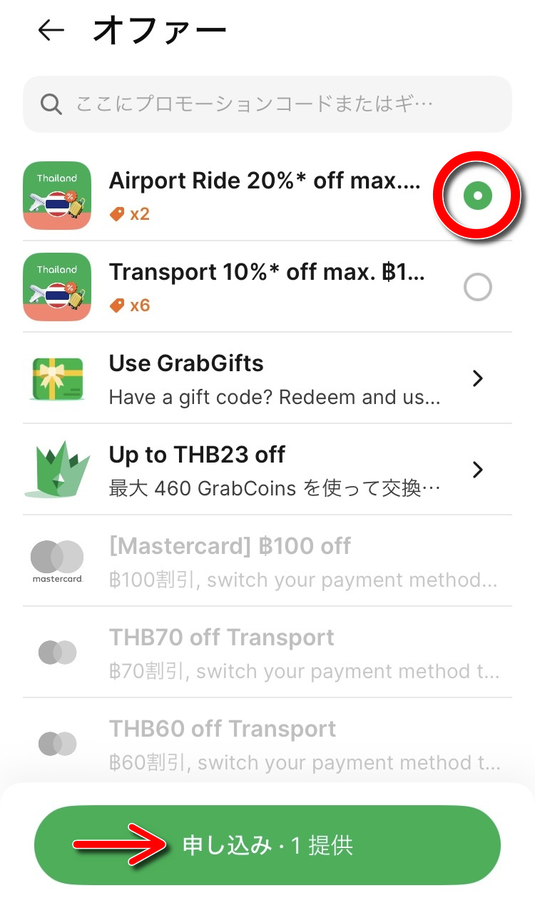 ★利用したいサービス(例:空港送迎/一般乗車/食事など)を予約・注文する前に、必ず「Offers」あるいは「Use Offers」からバウチャーを適用するようにしましょう。適用しないと通常料金となる可能性があります。