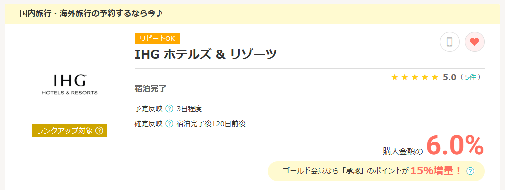 登録後にモッピ-のトップページから広告検索で「IHG」と入力すると出てきますので、「POINT GET」をクリックしてIHG公式サイトから予約してみましょう。